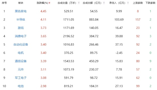 板块方面,黑色家电、半导体、游戏等板块涨幅居前,贵金属、种植业与林业、养殖业等板块跌幅居前。