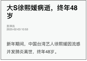荆楚网(湖北日报网)讯(记者叶修颀、舒俊杰)近日,多家媒体报道,因感染流感,中国台湾女演员、歌手、主持人徐熙媛(大S)因流感并发肺炎而猝逝,年仅48岁。27岁青年男演员梁祐诚于1月30日大年初二,因中枢神经感染于医院不幸离世。接连噩耗,令人震惊和惋惜。