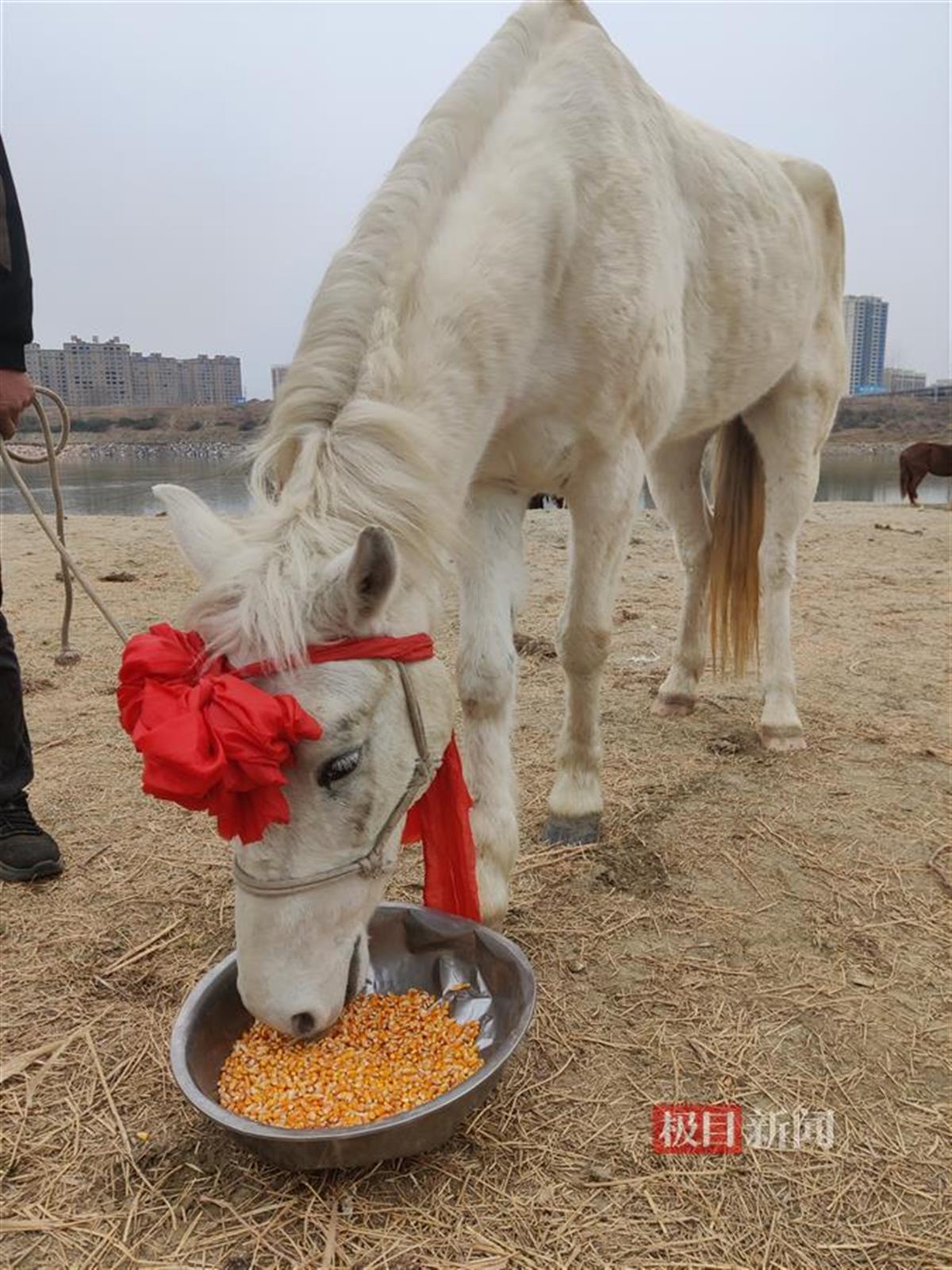 湖北仙桃江边,三人一马在江中接力救起落水者,次日救人的“白龙马”因受凉发高烧,牵动了无数网友的心。2月6日,其主人新疆大哥依立拜委托极目新闻向广大网友报平安:“‘白龙’退烧了,还吃了不少玉米粒和胡萝卜。”