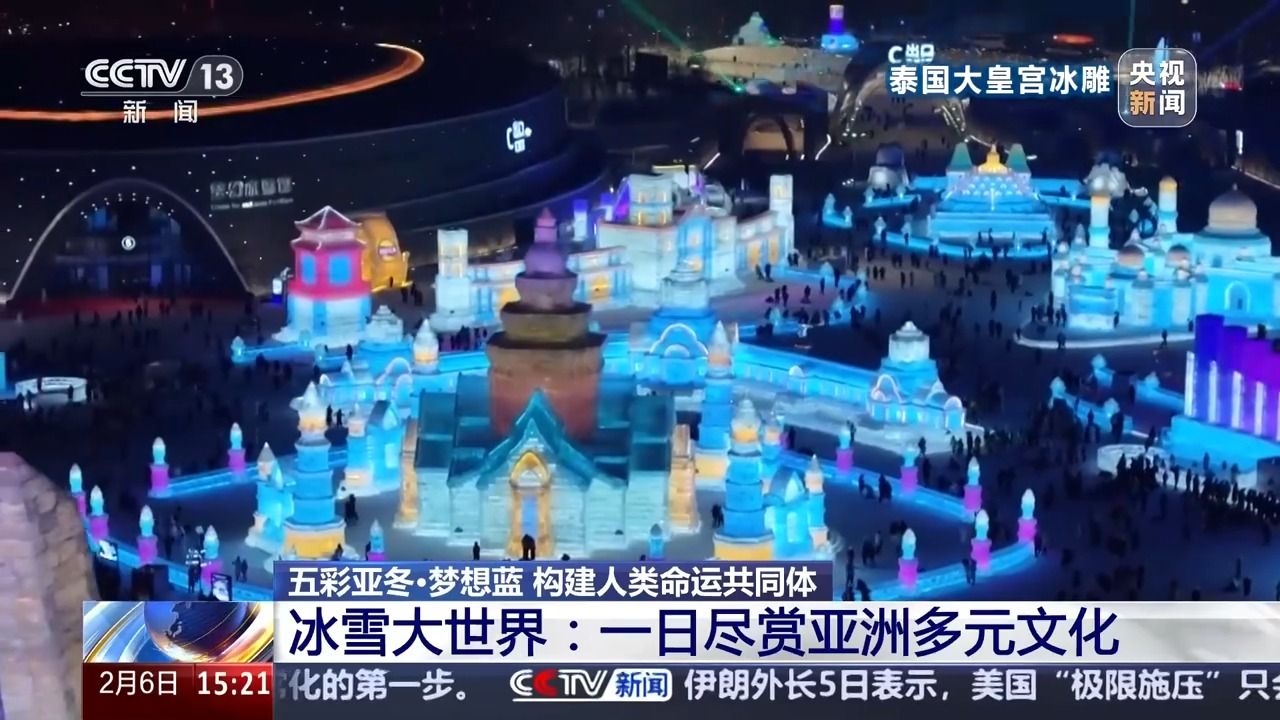 总台央视记者 赵晶:不必远行跋涉,一天之内就可以周游亚洲各地,启航一段精彩的文化之旅,这样的梦想在哈尔滨冰雪大世界就可以实现了,在我背后可以看到中国天坛,它是中国古代建筑艺术的瑰宝,用冰雕的形式来呈现,在天坛四周环绕式分布着亚奥理事会东亚区成员的标志性建筑。