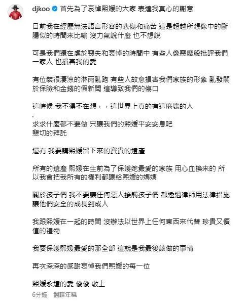 具俊晔在声明中写道,这几天他在经历无法用语言形容的悲伤和痛苦,但就在他们一家人还处在“失去与哀悼”的悲伤阶段中时,有些人却“像恶魔一般批判他们一家人,伤害我的爱。”