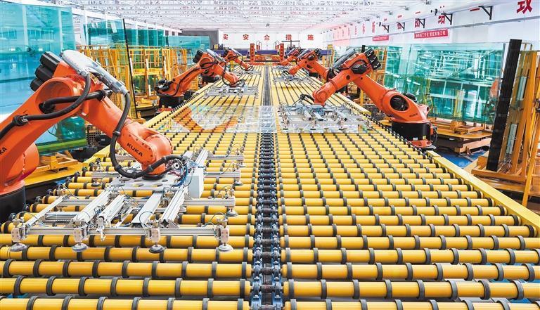 2月6日,河北石家庄玉晶玻璃有限公司生产车间,机器人进行玻璃自动分类搬运作业。张晓峰摄(中经视觉)