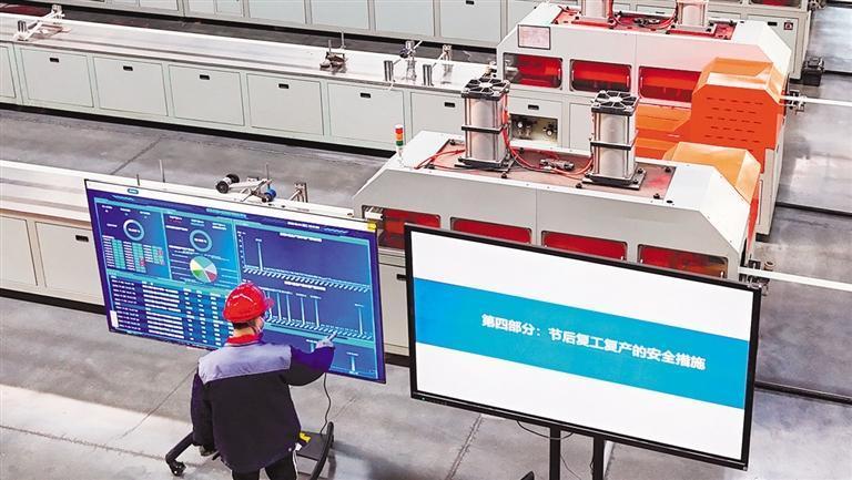 2月5日,位于江苏连云港经济技术开发区的中复碳芯电缆科技有限公司,工人在车间查看数字化玻璃纤维拉挤板材生产线运行情况。耿玉和摄(中经视觉)