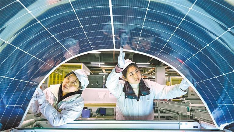 2月5日,安徽省合肥庐阳经济开发区大恒能源科技有限公司,工人在检测光伏柔性组件质量。赵 明摄(中经视觉)