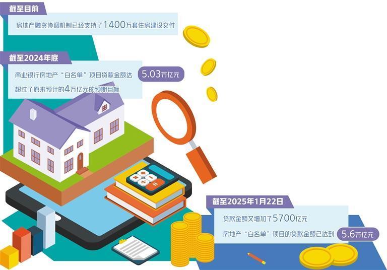 2024年是房地产融资协调机制全面落地的第一年,截至目前,房地产融资协调机制已经支持1400万套住房建设交付。国家金融监督管理总局副局长肖远企表示,“白名单”机制为房地产项目建成交付提供了充足稳定的资金保障。截至2024年底,商业银行房地产“白名单”项目贷款金额达5.03万亿元,超过了原来预计的4万亿元的预期目标。截至2025年1月22日,贷款金额又增加了5700亿元,房地产“白名单”项目的贷款金额已达到5.6万亿元。