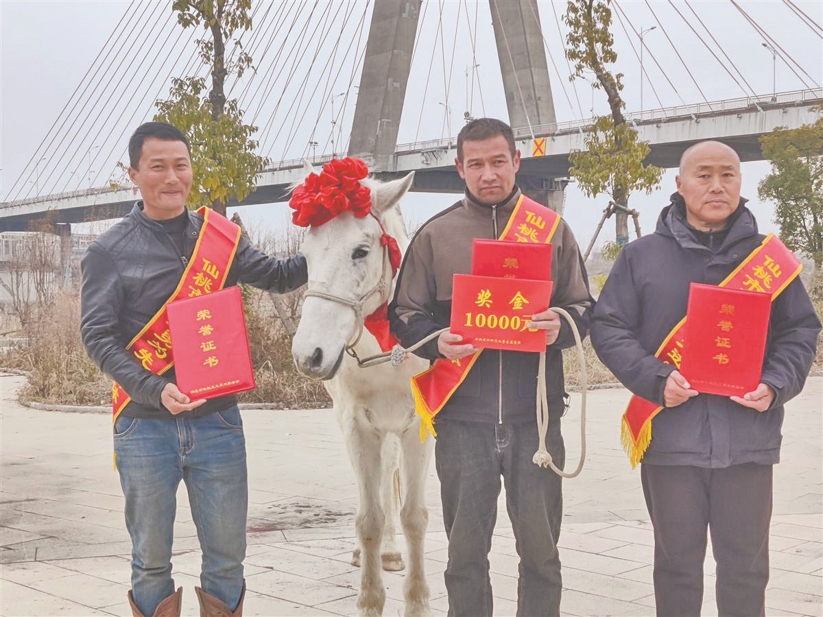 与此同时,骑马救人事件在全网刷屏后,不少网友呼吁,除三位救人英雄外,还应该给“白龙马”授予见义勇为的称号。当天上午,经相关认定程序,仙桃见义勇为基金会授予依立拜、刘杭州、苏邵高三位为2025年度“仙桃市见义勇为先进群体”,“白龙马”头戴红绸与骑马救人三人组一同接受见义勇为表彰。
