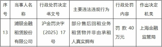 中国经济网北京2月7日讯 国家金融监督管理总局网站日前发布的上海监管局行政处罚信息公开表(沪金罚决字〔2025〕17号)显示,浦银金融租赁股份有限公司部分售后回租业务租赁物并非由承租人真实拥有,上海金融监管局对其罚款40万元。