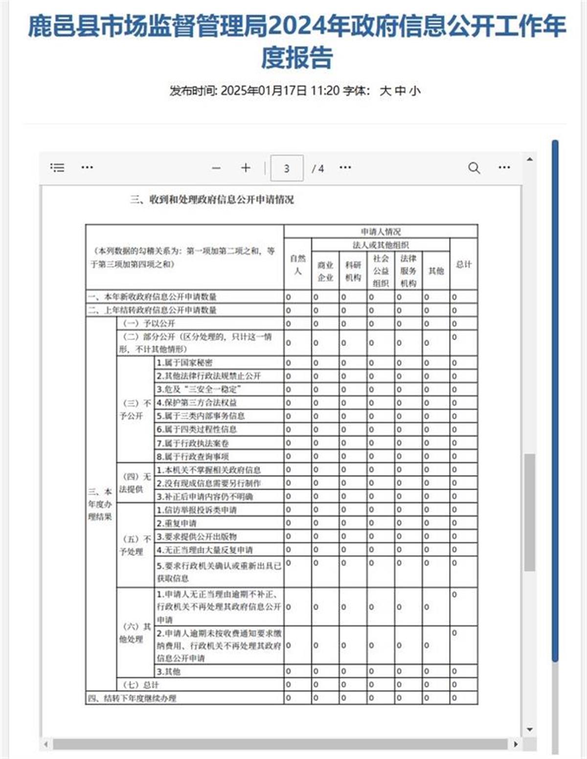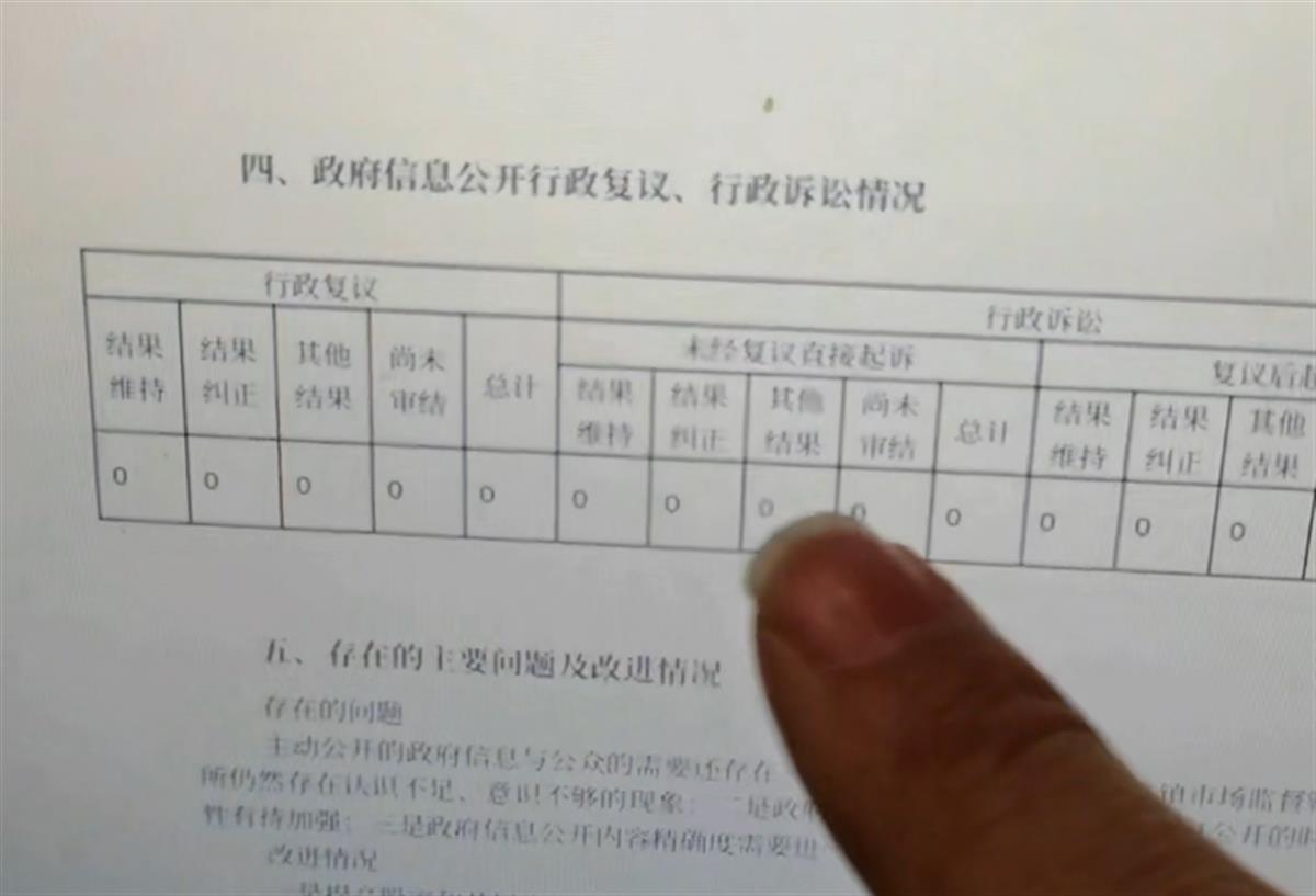 2月7日,一名知情人士向极目新闻记者提供的举报视频显示,举报者指出,鹿邑县市场监管局的这份《报告》发布时间为2025年1月17日,收到和处理政府信息公开申请情况及政府信息公开行政复议、行政诉讼情况均为0,这与实际情况不符。