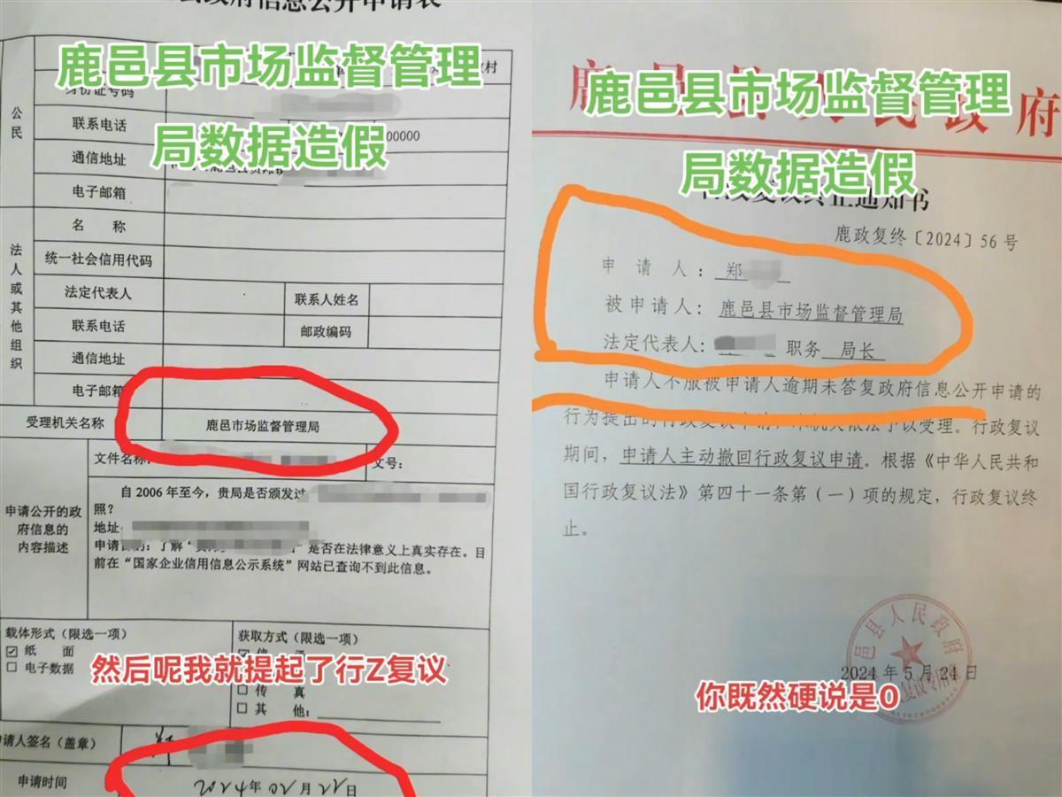 举报者称,2024年2月,他以邮寄的方式向鹿邑县市场监管局申请政府信息公开,未得到批准。同年,他就此提起了行政复议。2024年5月,鹿邑县政府出具的行政复议通知书显示,申请人为郑某,被申请人为鹿邑县市场监管局。“(2024年)别人有没有申请(政府信息公开),我不知道。”他称:“但我个人申请过,还行政复议了。这份《报告》涉嫌数据造假。”