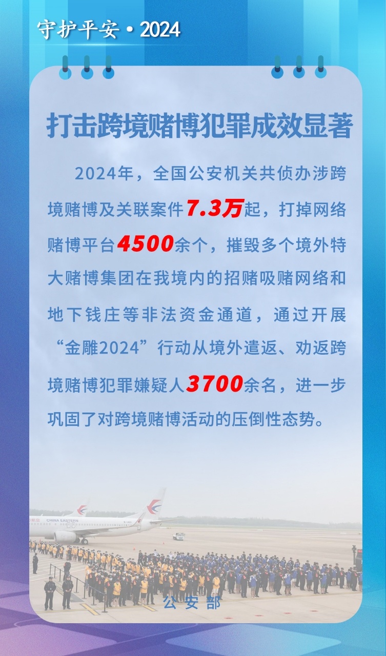 记者从公安部获悉,2024年,全国公安机关强力推进打击治理跨境赌博各项工作,截至2024年12月,共侦办涉跨境赌博及关联案件7.3万起,打掉网络赌博平台4500余个,摧毁多个境外特大赌博集团在我境内的招赌吸赌网络和地下钱庄等非法资金通道。