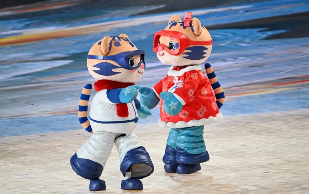 2月7日,吉祥物“滨滨”“妮妮”现身开幕式现场。新华社记者 陈振海 摄