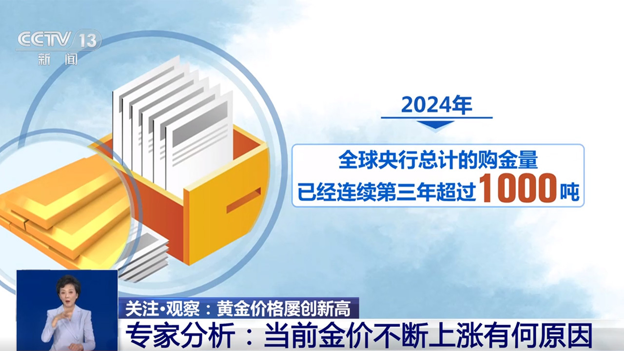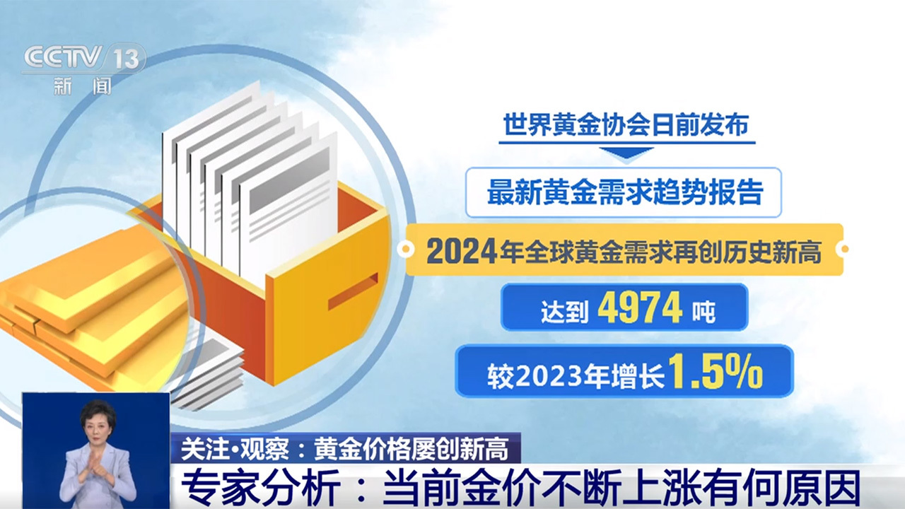 世界黄金协会日前发布的最新黄金需求趋势报告显示:2024年全球黄金需求再创历史新高,达到4974吨,较2023年增长1.5%。专家表示,需求增长与地缘冲突和经济不确定性等因素相关。除此之外,全球央行增加黄金储备,以及全球央行的货币政策也对金价有一定影响。数据显示,2024年,全球央行总计的购金量已经连续第三年超过1000吨。