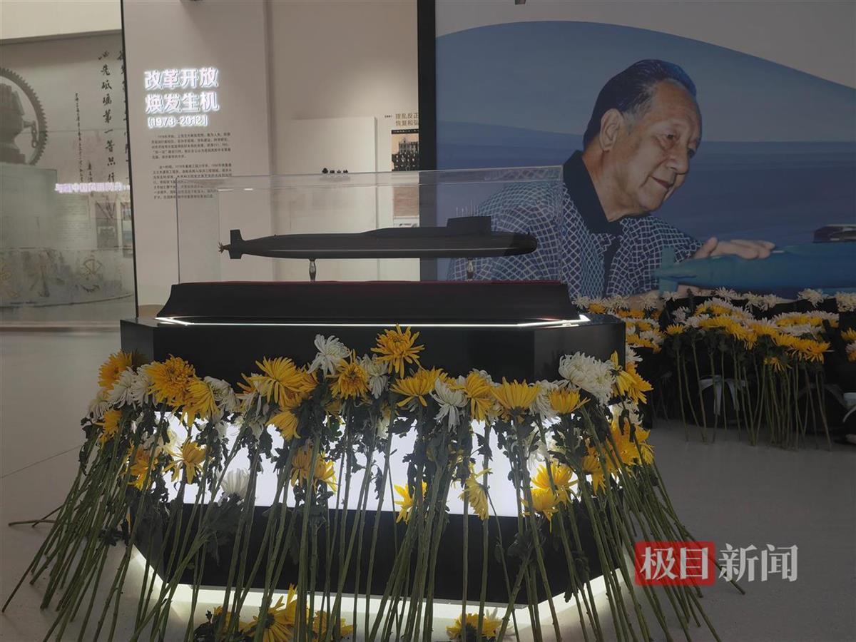 一楼大厅船建学院展示馆正在举行“为祖国‘深潜’——黄旭华院士专题展”,一艘“长征一号”核潜艇模型格外醒目,模型后面是黄旭华院士的大幅照片。记者看到,潜艇模型和大幅照片前,已摆满了前来悼念黄老的师生敬献的鲜花。
