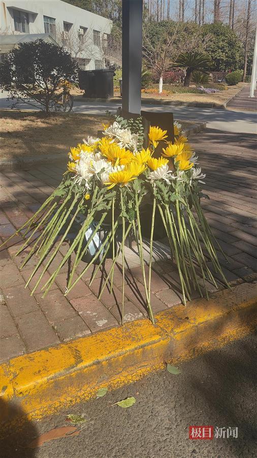 旭华路上摆放了师生敬献的鲜花