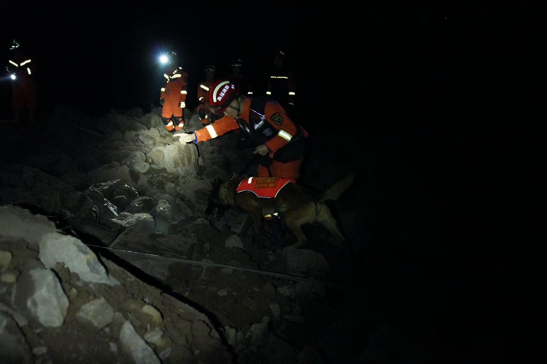 2月8日,四川宜宾筠连县突发山体滑坡。图为2月8日夜,消防救援人员利用搜救犬、生命探测仪从下至上对垮塌废墟进行搜索,对关键点位进行标注后,对废墟现场进行浅表搜救。