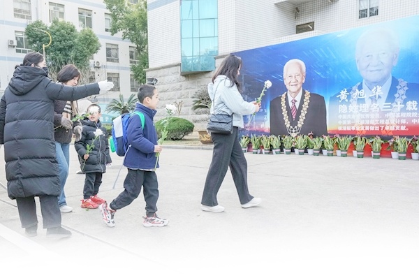 2月8日一大早,来自武汉市中山路小学的百余名师生代表来到吊唁现场,向黄旭华献花。