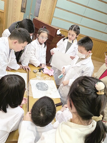 “这是什么字,认识吗?”“这是繁体字的‘乐观’二字。”“你知道拓片是做什么用的吗?”“拓片是将考古文物上的文字和图案拓到纸上,好更好地去辨认和研究。”参与回答问题的同学还获得了精美的冰箱贴、笔记本等考古文创礼物。