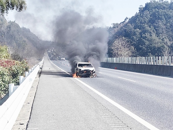 湖南高速警察岳阳支队岳阳楼大队民警介绍,1月29日中午12时许,民警在辖区杭瑞高速岳阳段巡逻,行至杭瑞高速岳阳段783公里处,发现对向车道一小车停在行车道正在燃烧。发现这一警情后,民警立即下车到对向车道查看、处置。