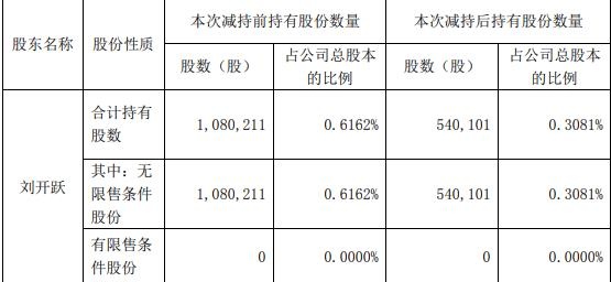 刘开跃以集中竞价方式于2024年12月17日至2024年12月20日合计减持54.01万股,占公司总股本的比例0.3081%,减持均价54.11元/股。