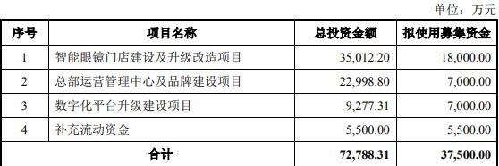 本次发行可转换公司债券的募集资金总额不超过人民币37,500.00万元(含),扣除发行费用后的募集资金净额拟用于智能眼镜门店建设及升级改造项目、总部运营管理中心及品牌建设项目、数字化平台升级建设项目、补充流动资金。