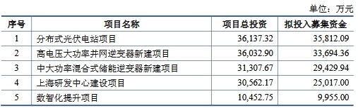 本次向不特定对象发行可转债募集资金总额不超过人民币169,408.38万元(含本数),扣除发行费用后募集资金净额将投资于以下项目:分布式光伏电站项目、高电压大功率并网逆变器新建项目、中大功率混合式储能逆变器新建项目、上海研发中心建设项目、数智化提升项目。