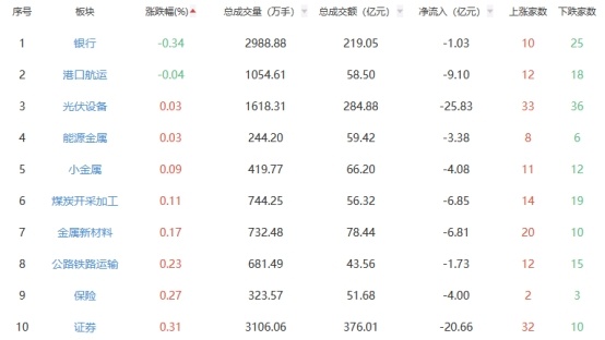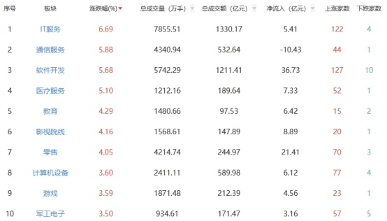 行业板块方面,IT服务、通信服务、软件开发等板块涨幅居前,银行、港口航运板块下跌。