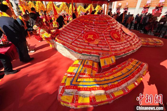 2月10日,福建泉州霞洲妈祖宫与台湾澎湖天后宫携手举办“平安米龟、水果龙”开光点睛仪式。中新社记者 吕明 摄