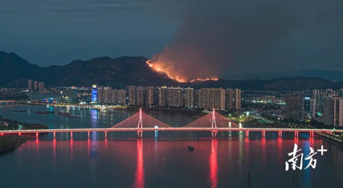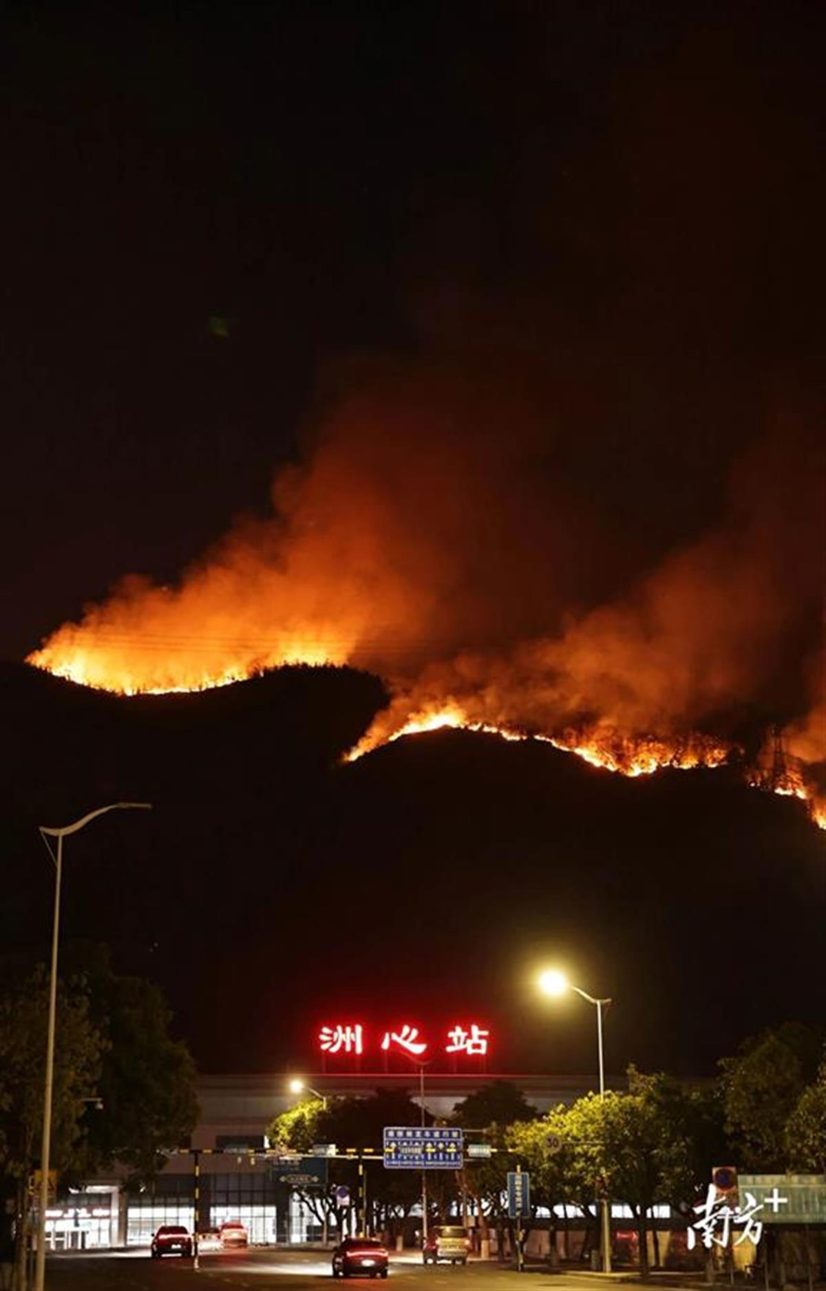 2月9日晚,山火逼近武广高铁清远站和珠三角城际轨道广清城际洲心站,高铁正常运行,未受山火靠近影响。(图源:南方+)