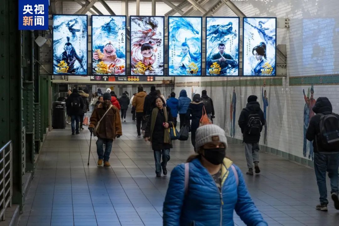在纽约多个繁忙的地铁站,《哪吒2》海报登陆电子屏幕。