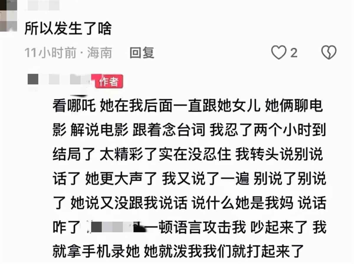 该网友在网帖中介绍,观看“哪吒2”时,后排有观众不停地说话,还解说电影,跟着念台词,持续了近2小时。电影播放到双方激战的精彩剧情时,该网友没忍住,便提醒后排观众别说话,这名老人开始骂骂咧咧,之后双方吵起来了,发生了泼奶茶的一幕。
