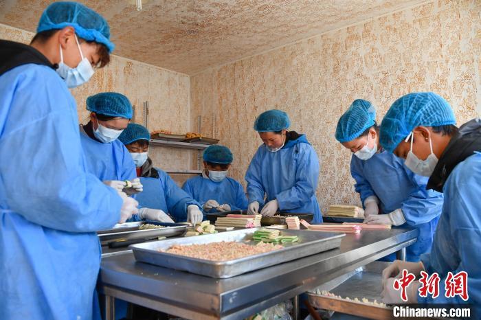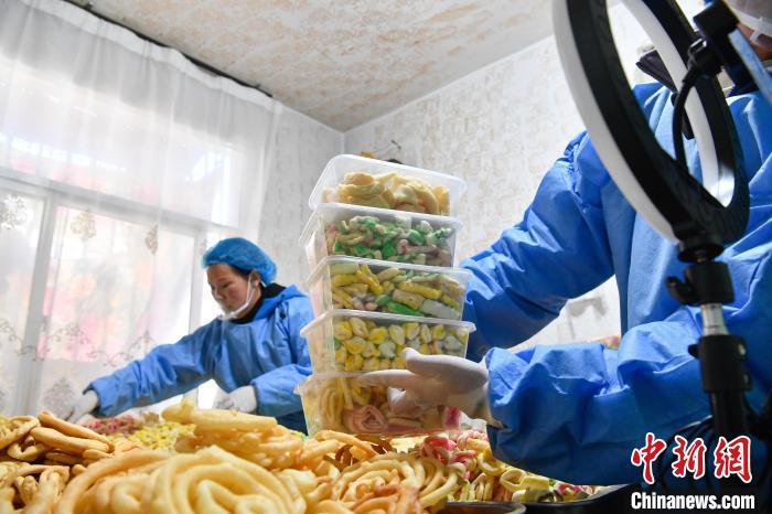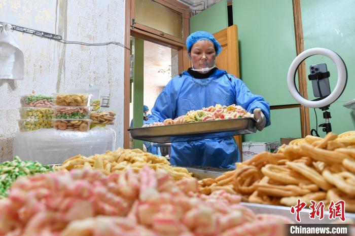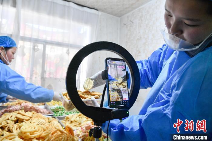 2月10日,西藏拉萨市林廓北路一家卡塞店里,工人在直播卖卡塞。“卡塞”是一种油炸面食,是藏历新年必不可少的食物。随着藏历新年的日益临近,古城拉萨各个加工销售“卡塞”的店铺飘出阵阵香味。中新社记者 贡嘎来松 摄