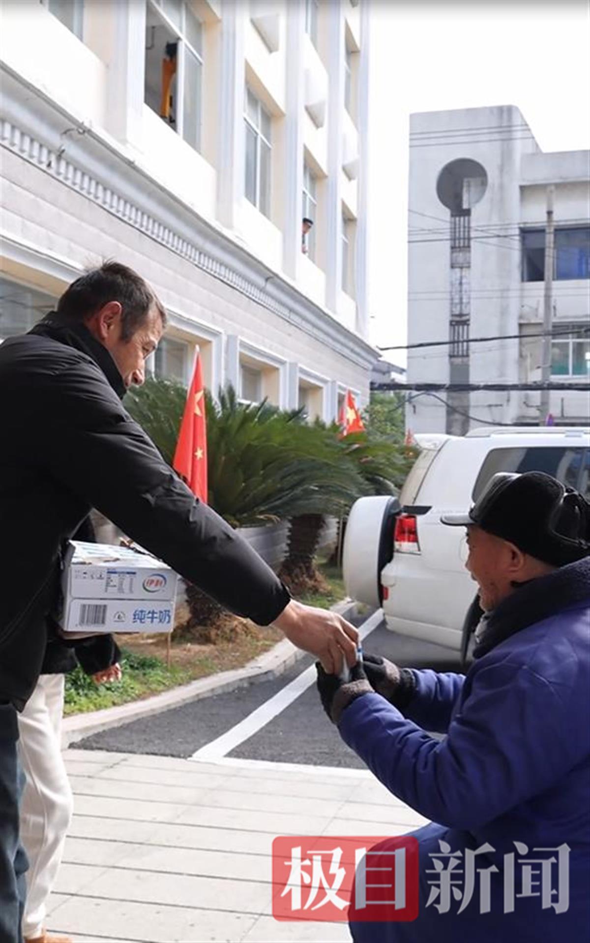 依立拜为老人们分发牛奶(视频截图)