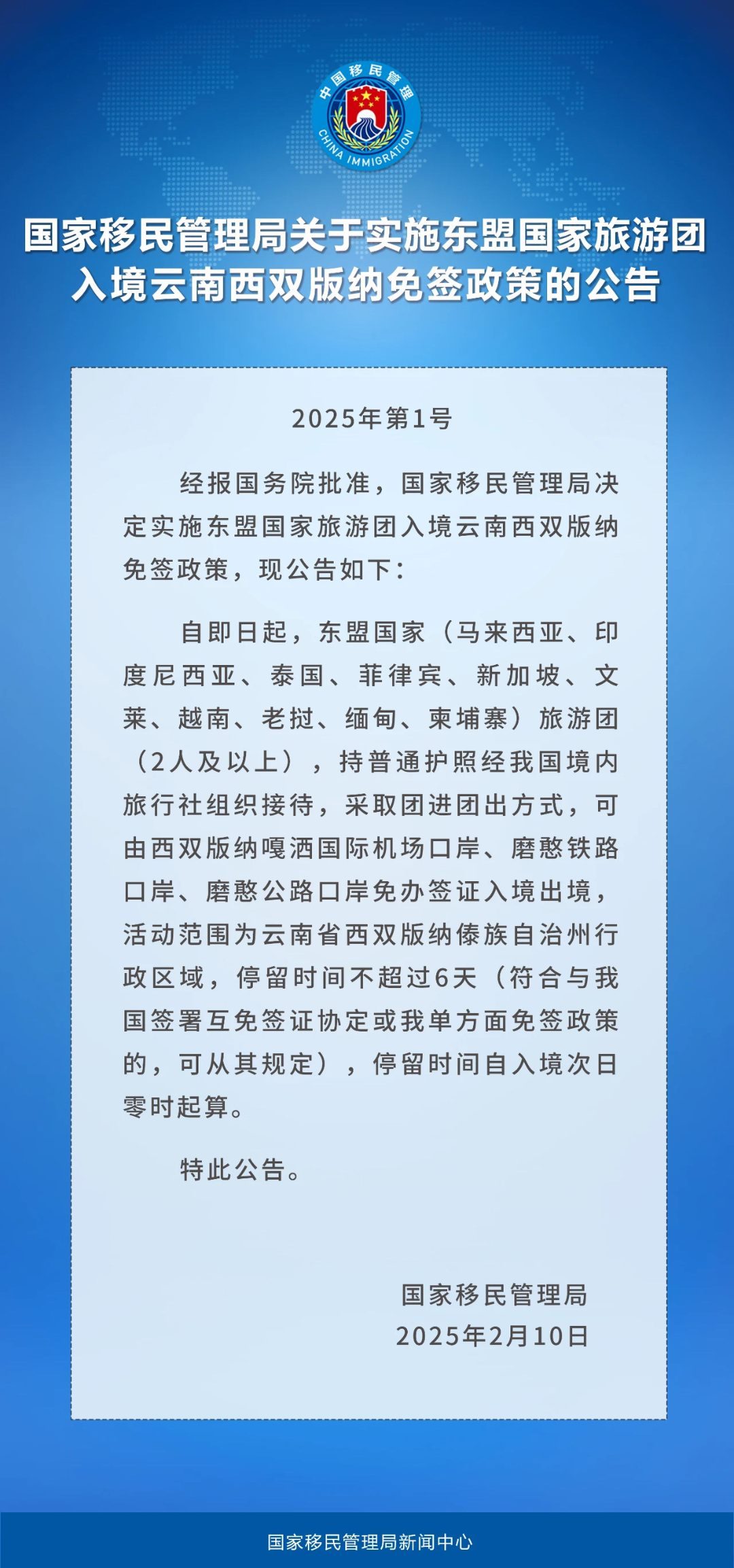 国家移民管理局10日发布公告,即日起,实施东盟国家旅游团入境云南西双版纳免签政策。马来西亚、印度尼西亚、泰国、菲律宾、新加坡、文莱、越南、老挝、缅甸、柬埔寨等10个东盟国家的旅游团(2人及以上),持普通护照经我国境内旅行社组织接待,可由西双版纳嘎洒国际机场口岸、磨憨铁路口岸、磨憨公路口岸免办签证整团入境出境,活动范围为云南省西双版纳州行政区域,停留时间不超过6天。