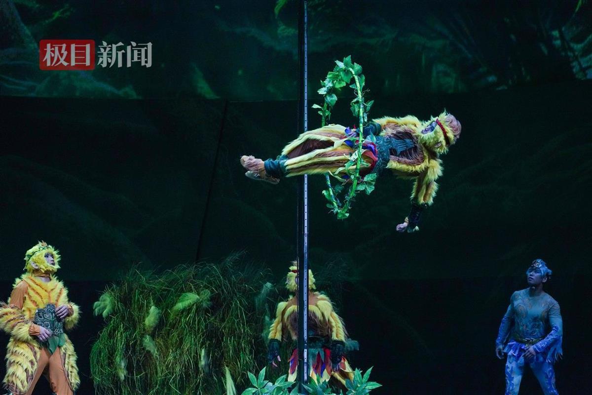 比如,“礼族”是一群姿态优雅的“青头潜鸭”,杂技演员身着厚重的天鹅式礼服,踩着独轮车演绎着在水中欢快游泳的场景;擅长跳跃的“义族”利用杂技技巧“钻圈”来表现这一特长,而这次挑战更大:因为“猴子”们都带着长长的尾巴!因此,每一次“猴子”钻过几米高的绳圈,全场的小观众尖叫声最响。