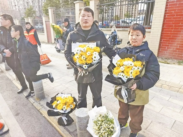 2月10日在武昌殡仪馆门口,10岁的张译程跟爸爸一起来给黄旭华院士送花。张译程的爸爸张勇是光谷一家花店的老板,这两天,已经有全国各地的20多份订单,请他代为向黄老献花。他和张译程,也为黄老献上了自己的一束花。张译程说,他知道黄爷爷是一位造核潜艇的科学家,他也要向黄爷爷学习,做一个对国家有用的人。