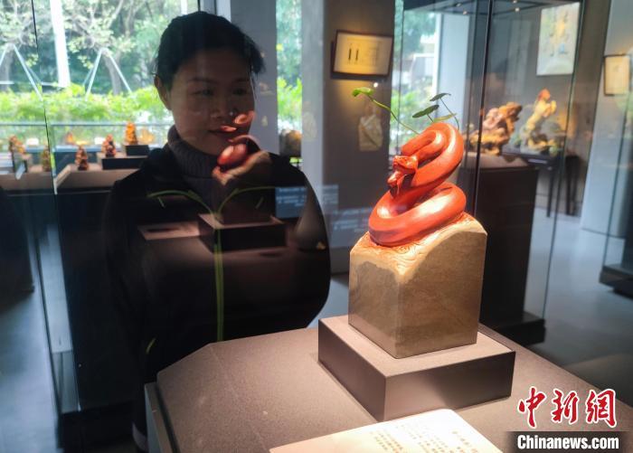 2月11日,“灵蛇舞春——寿山石雕艺术迎新展”在福州为新印钮艺术馆展出,吸引市民、游客前去参观。马洛 摄