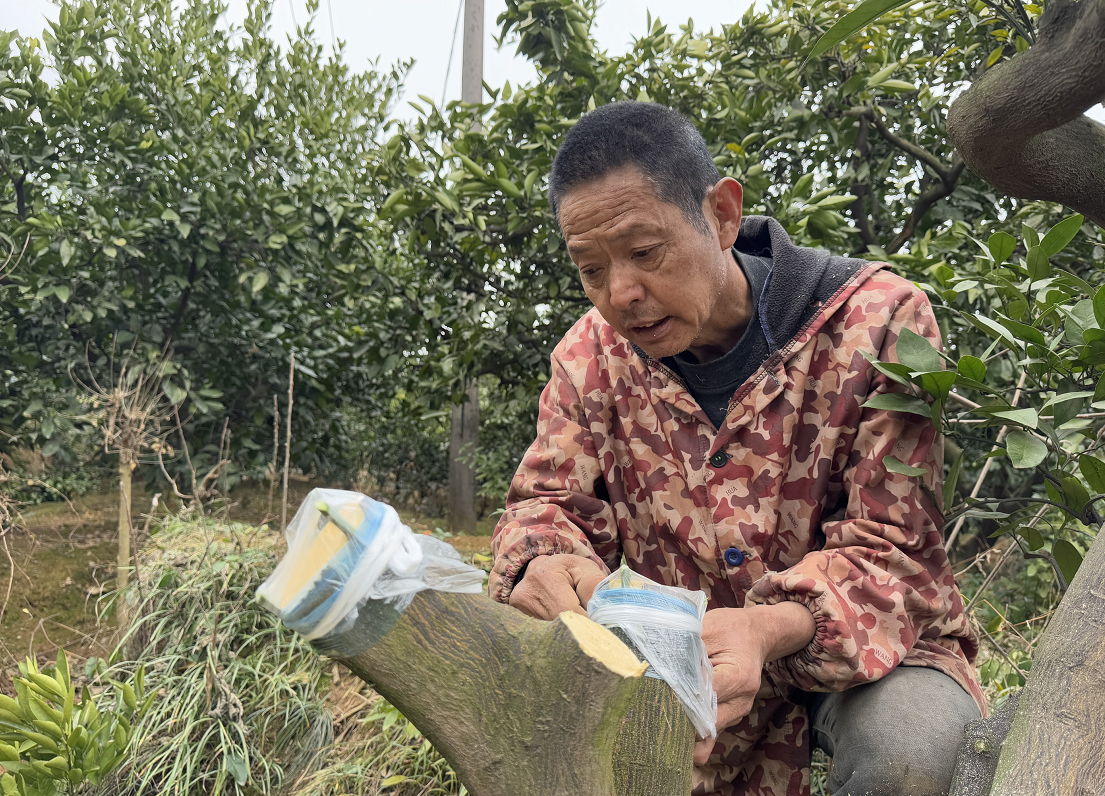 △吴辉青正在帮村民的橘树做品改嫁接。(记者曹阳 摄)