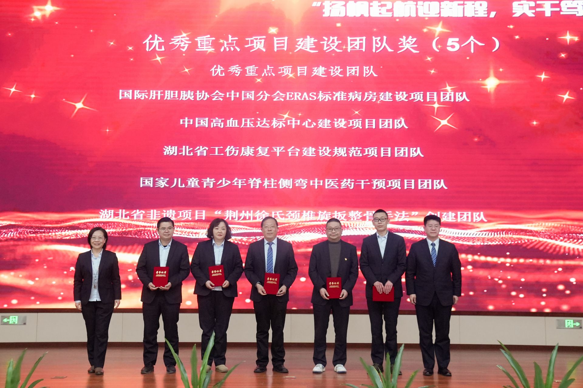 医院党委副书记、纪委书记邓黎宣读了表彰决定。2024年度新业务、新技术优秀项目、优秀重点项目建设团队、市级临床重点专科、省级中医重点专科、国家中医优势专科等获奖代表分别上台领奖。