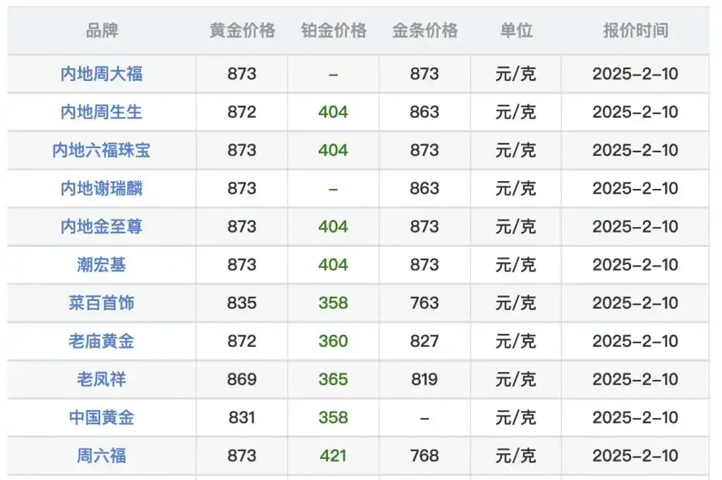 而在零售端,2月10日,周大福等品牌金店的足金饰品报价达每克873元,较1月1日每克799元的报价上涨74元,今年以来的累计涨幅超过9%。