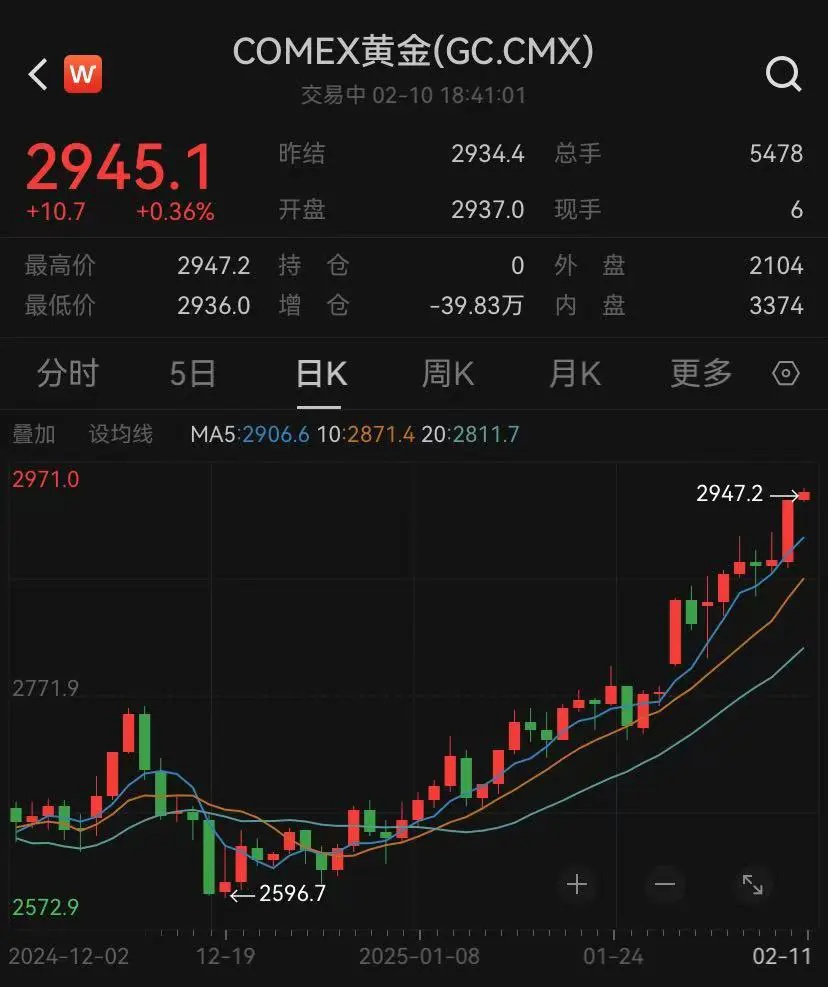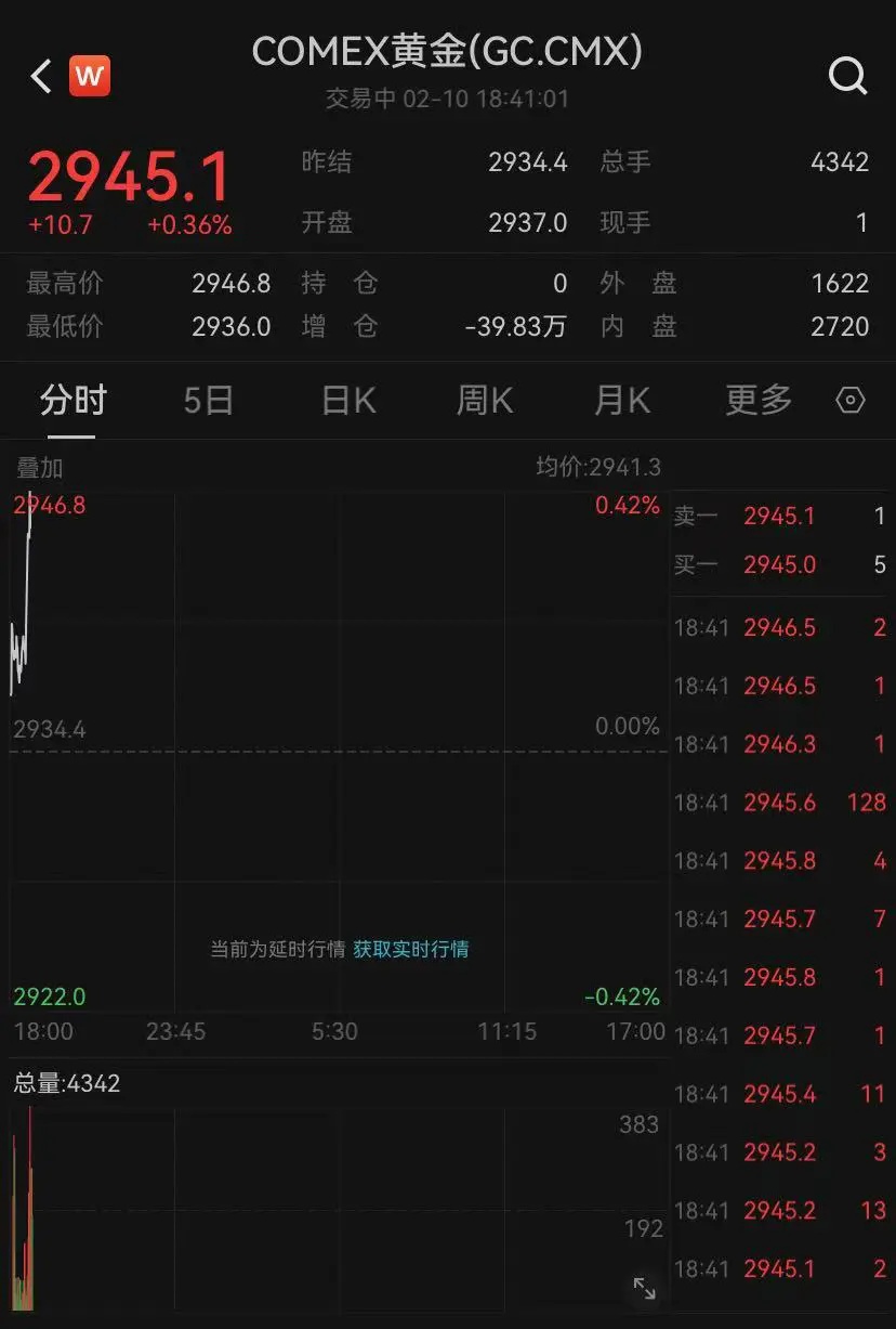 COMEX黄金期货也直线拉升,盘中超2945美元/盎司。