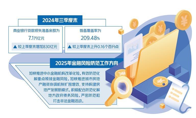 最新数据显示,我国商业银行风险抵补能力整体充足。2024年三季度末,商业银行贷款损失准备余额为7.1万亿元,较上季度末增加830亿元;拨备覆盖率为209.48%,较上季度末上升0.16个百分点。