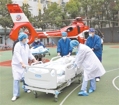 医护团队小心护送患者上机。13时57分,直升机腾空而起,直飞武汉。一路上,医护人员严密监测患者的生命体征。