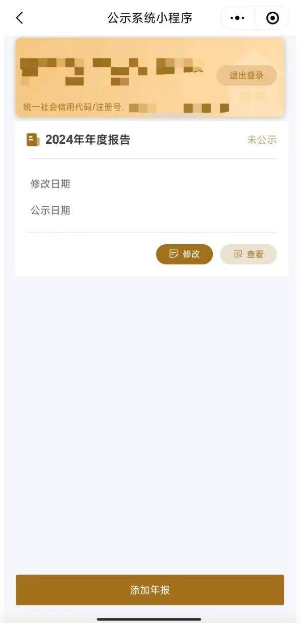 第三步,注册完毕后,以后每次输入统一社会信用代码/注册号以及联络员证件号码,系统自动带出其余信息,点击“获取验证码”,验证通过后即可快速登录。成功登录后,自动跳转到年度报告管理页面,可以查看历年已公示或已修改待公示年报。点击“添加年报”按钮,选择对应年度,点击确定按钮后,跳转到年报填报页面。