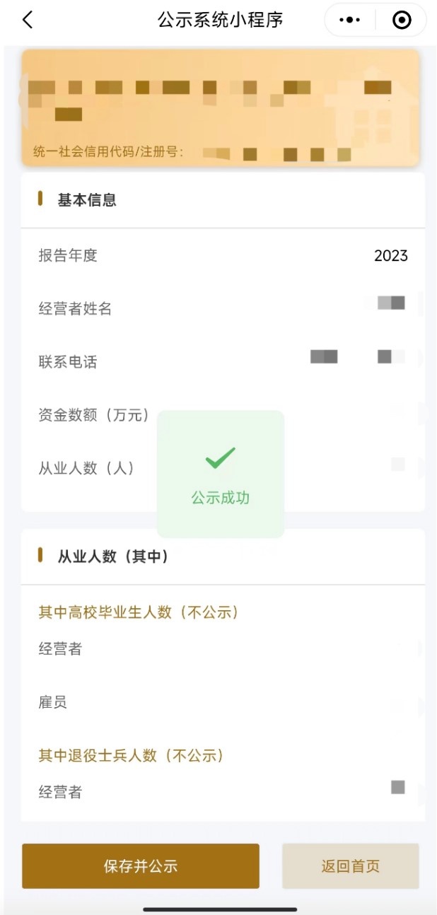 第四步填写并公示年报进入填报页面后,个体工商户需按照步骤逐一填写空白信息。为方便填写, 可点击“导入上一年度信息”按钮, 导入上一年度年度报告,进行信息修改和确认。填写完毕后, 点击“预览并提交”。进入年报预览页面,预览无误后,点击“保存并公示”,显示“公示成功”后即可完成年报填报。