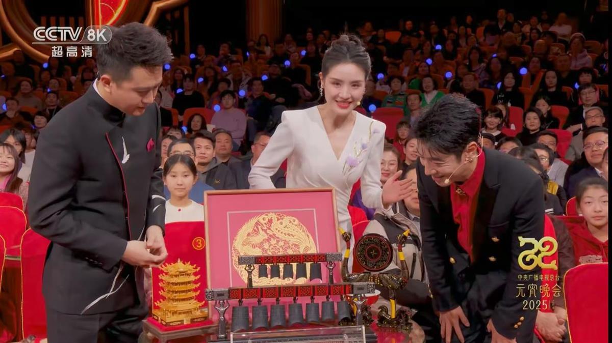 原来,武汉刚刚登陆央视元宵晚会串联环节,湖北卫视节目主持人陈超带来了来自武汉的礼物——黄鹤楼微缩模型、凤凰剪纸之外,一根长达2.33米的藕,让武汉人撒贝宁也忍不住想起了家乡的那碗藕汤。