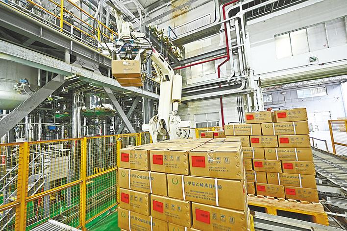 2月12日,位于宜昌的湖北兴瑞硅材料有限公司有机硅单体一车间内,智能化生产设备高速运转,从原料到成品,全程由机器完成,一派繁忙。 (湖北日报全媒记者 刘曙松 通讯员 谭雪姣 蔡晓舒 摄)