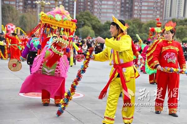 14时30分,来自钟祥各乡镇的48支非遗民俗表演队伍从钟祥莫愁湖畔的明显陵游客中心出发,绕着莫愁湖路一路巡游至体育中心南广场,进行集中展演。