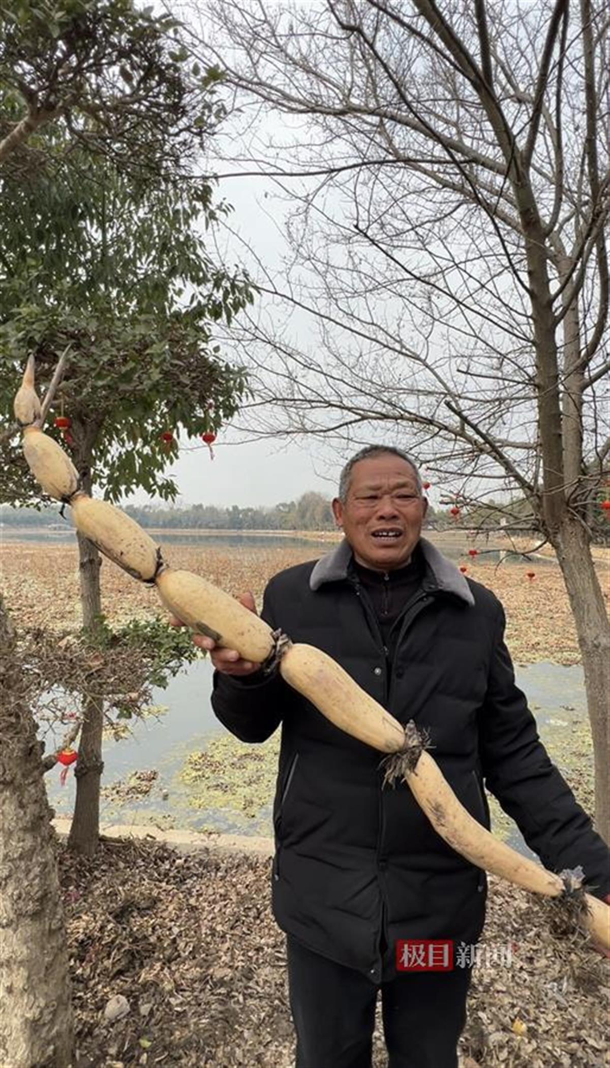 2月13日,极目新闻记者现场采访得知,这根超过2米长的莲藕就来自武汉市蔡甸区蔡甸街道永利村武汉民食为天食品有限公司莲藕种植基地。该藕是由65岁的蔡甸藕农朱良庭亲手挖掘的。他说,这根藕是在2月8日挖出来的,当天他在藕田齐胸深的泥水里挖掘了半小时才成功取出。