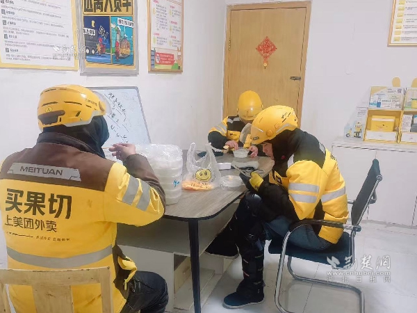 外卖骑手们吃汤圆。 通讯员供图