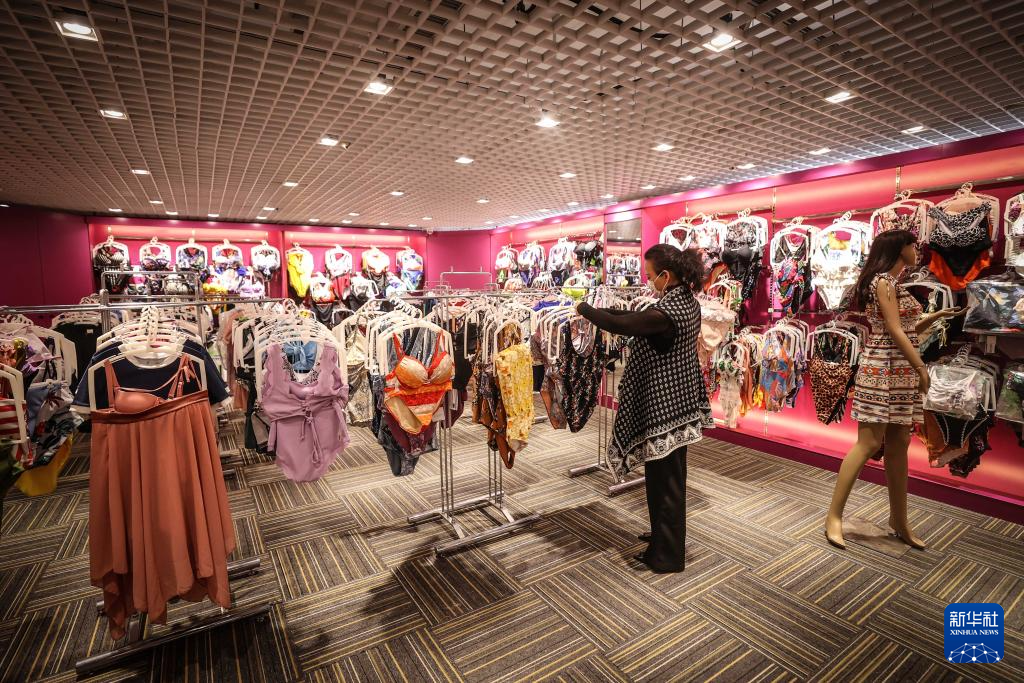 2021年4月7日,工作人员在葫芦岛斯达威集团泳装展示间整理泳装样品。新华社记者 潘昱龙 摄